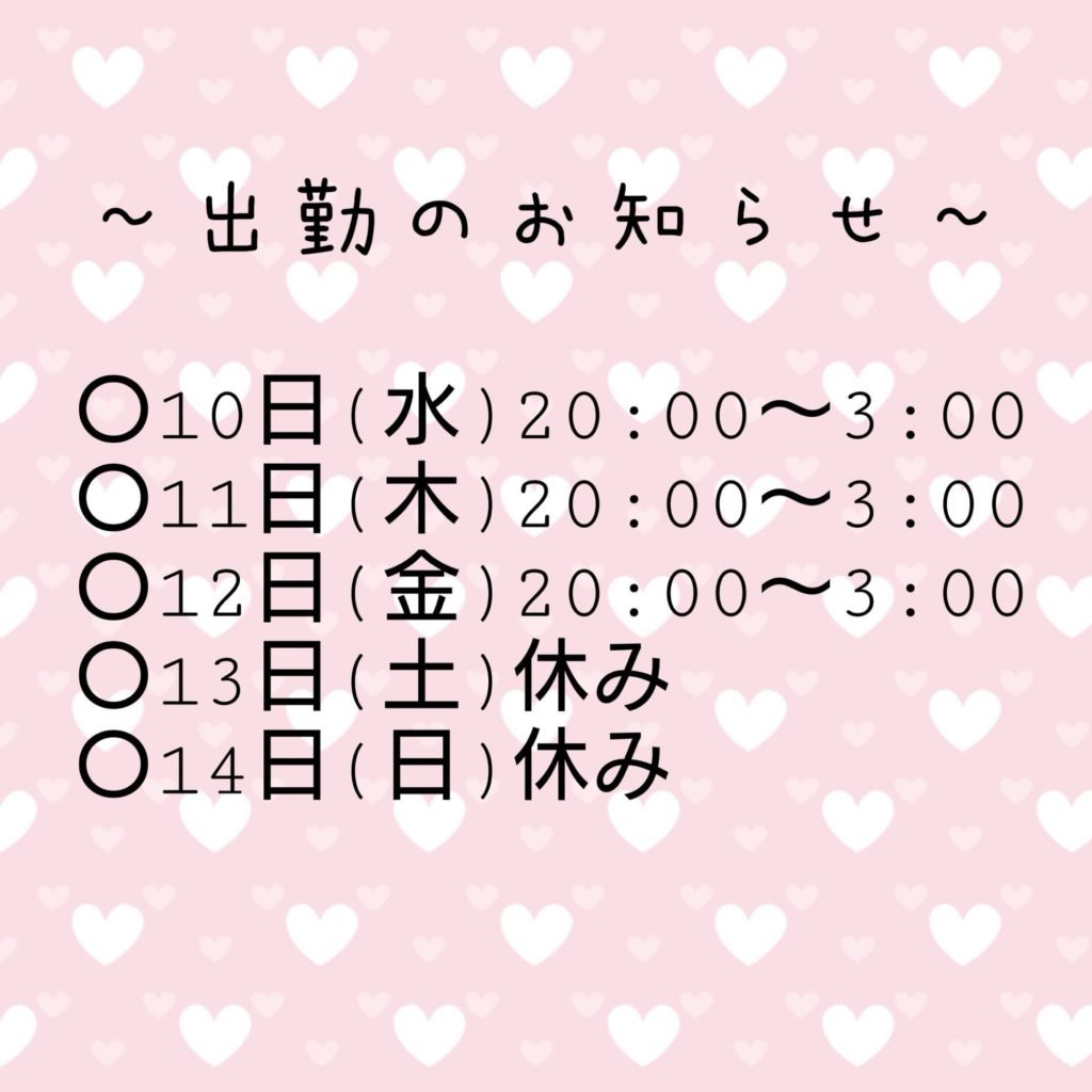 えみです 出勤のお知らせいたします 〇10日(水)20:00~3:00〇11日(木)20:00~3:00 〇12日(金)20:00~3:00〇13日(土)休み〇14日(日)休みです よろしくお願いいたします 春うらら えみ